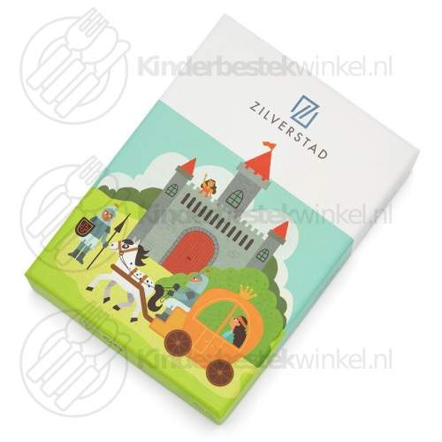 Knights and princesses children's cutlery stainless steel 4-pieces by Zilverstad in carton gift box. Free engraving of fork, knife, spoon and dessert-spoon (all cutlery parts) at front or back side is possible.