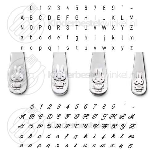 Deze Nijntje kinderbestek set is geschikt voor graveren van de lepel, vork en lepel, vork, mes en lepel, vork, lepel en dessertlepel of alle bestekdelen met bijvoorbeeld naam en/of datum in één van onze lettertypes.