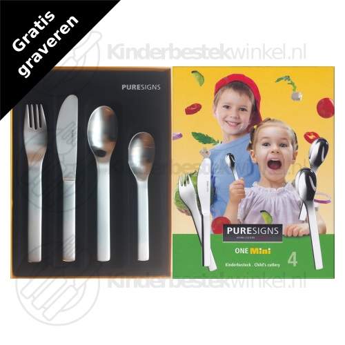 One Mini kinderbestek set mat 4-delig van Puresigns in kartonnen geschenkverpakking. Gratis graveren van vork, mes, lepel en dessertlepel (alle bestekdelen) aan voorzijde of achterzijde is mogelijk. Uitgebreid of dubbelzijdig graveren tegen meerkosten.