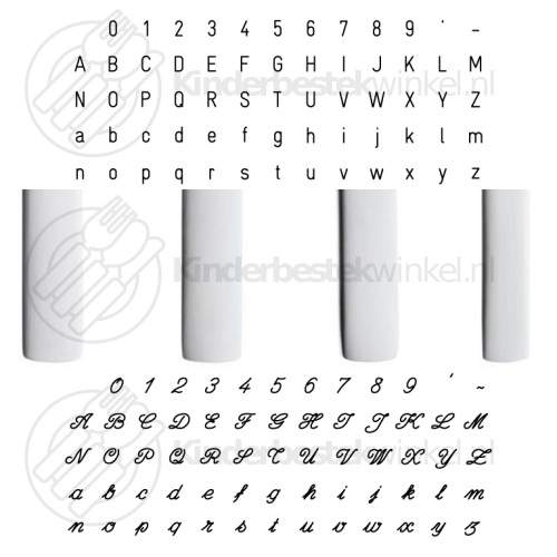 Deze matte One Mini kinderbestek set is geschikt voor graveren van de lepel, vork en lepel, vork, mes en lepel, vork, mes en dessertlepel of alle bestekdelen aan voor- en/of achterzijde met bijvoorbeeld naam en/of datum in één van onze lettertypes.