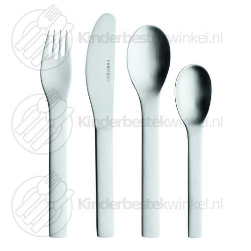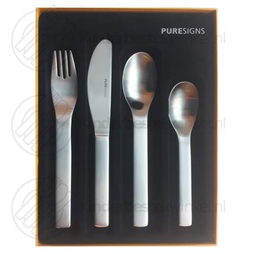 Deze Puresigns kinderbestek set bestaat uit een vork, mes, lepel en dessertlepel van gematteerd of geborsteld 18/10 edelstaal zonder print. Het is geschikt voor kinderen van circa 3 tot 6 jaar en ouder.
