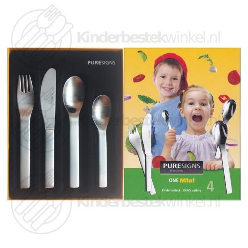 One Mini kinderbestek set rvs 4-delig (glans) van Puresigns in kartonnen geschenkverpakking.&nb..