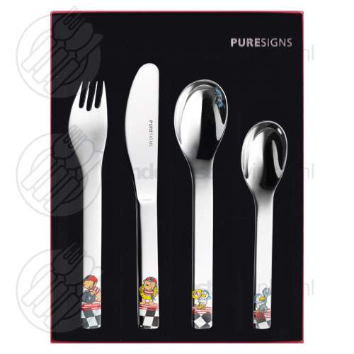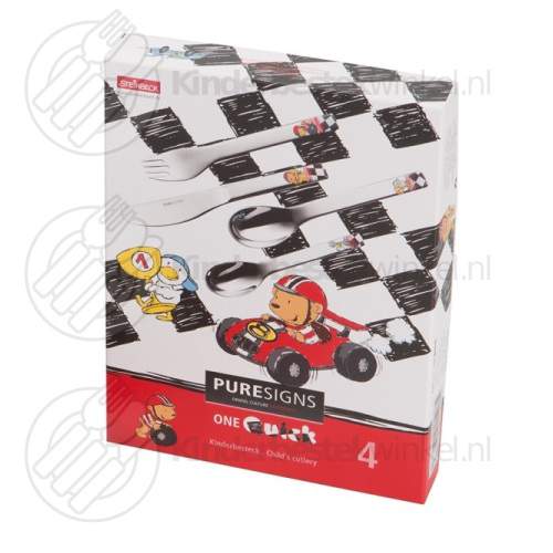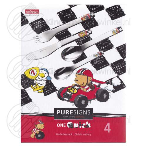 Deze Puresigns kinderbestek set bestaat uit een vork, mes, lepel en dessertlepel van hoogglans 18/10 edelstaal met Steinbeck autorace kleur opdruk. Het is geschikt voor kinderen van circa 3 tot 6 jaar en ouder.