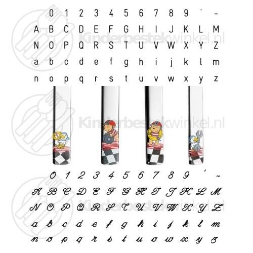 Deze Quick kinderbestek set van het model One met Steinbeck racing-thema is geschikt voor gratis graveren van de lepel, vork en lepel, vork, mes en lepel of alle bestekdelen aan achterzijde met bijvoorbeeld naam en/of datum in één van onze lettertypes.