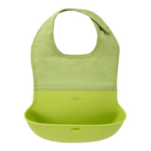 Slabbetje oprolbaar groen van OXO Tot van gladde, makkelijk afwasbare stof en duurzaam siliconenrubber met klittenbandsluiting.
