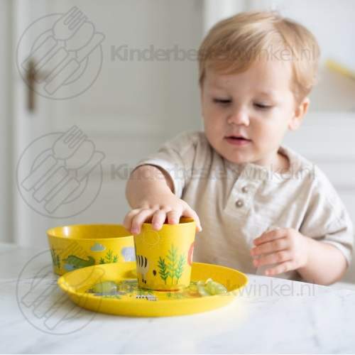 Bio-cirkulär Koziol Connect barnservis set med liten barntallrik, skål och kopp i färg organic yellow med Africa motiv.