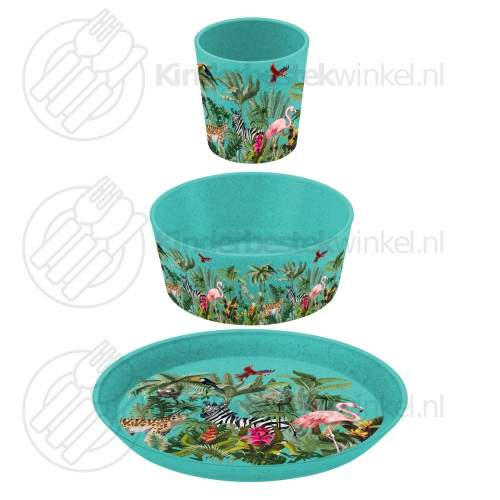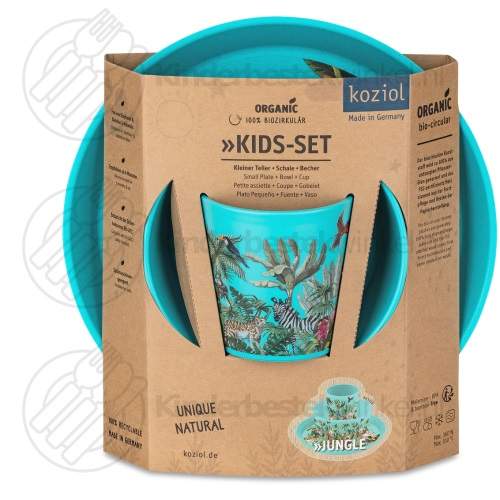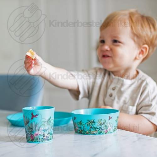Bio Cirkulär Koziol Connect barnservis set med liten barntallrik, skål och kopp i färg organic turquoise med Jungle motiv.