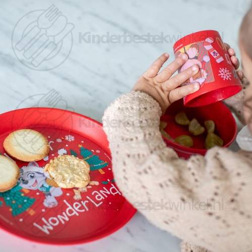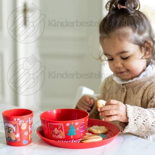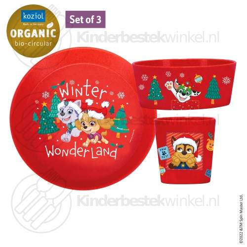 Paw Patrol Winter Wonderland barnset 3-delar av Koziol i kartong presentförpackning. Färg: organic ruby red. Innehåll: lite tallrik, skål och kopp.