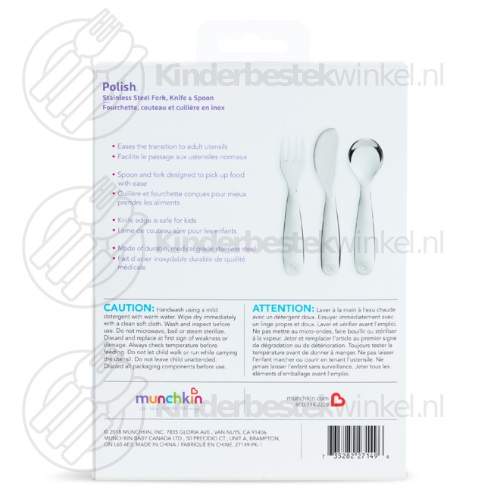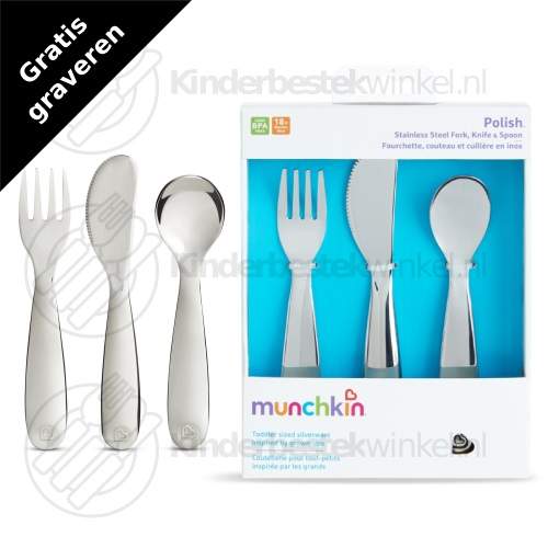 Polish barnbestick rf 3-delar av Munchkin i kartong. Fri gravyr av gaffel, kniv och sked på framsida är möjligt.