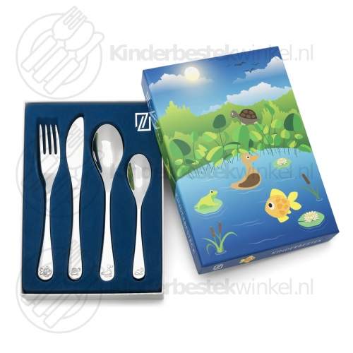 Vattenliv barnbestick rf 4-delar av Zilverstad i kartong. Fri gravyr av gaffel, kniv, sked och tesked (alla bestickdelar) på fram eller baksidan är möjligt.