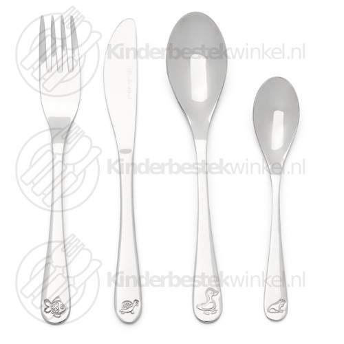 Vierdelig roestvrijstalen kinderbestek of kindercouvert van Zilverstad met als thema husdjur. Deze kinderbestekset bestaat uit een kindervork met varken, kinderlepel met schaap, kindermes met koe en kleine kinderlepel met kip. Het is geschikt voor kinderen van circa 3 tot 6 jaar en ouder.